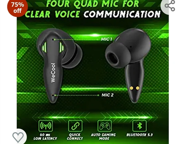 WeCool Moonwalk M4 ENC Gaming Earbuds, 48 Hours Playtime, Dedicated Gaming Mode, Deep Bass, 55 ms Low Latency, Dual Mic for Clear Calling, Touch Control, Bluetooth 5.3, Type C Charging, Auto Pairing